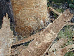 - Vertical bark splitting, exposing galleries created by larvae